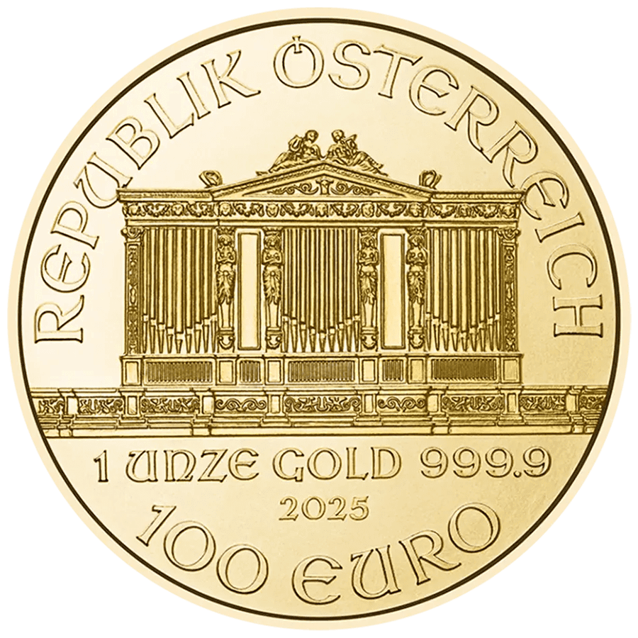 - Avers : L'avers présente une représentation minutieuse de l'orgue de la Philharmonie de Vienne, accompagnée des inscriptions « Republik Österreich », « 100 Euro », « 1 UNZE GOLD 999.9 » et de l'année « 2025 ».
