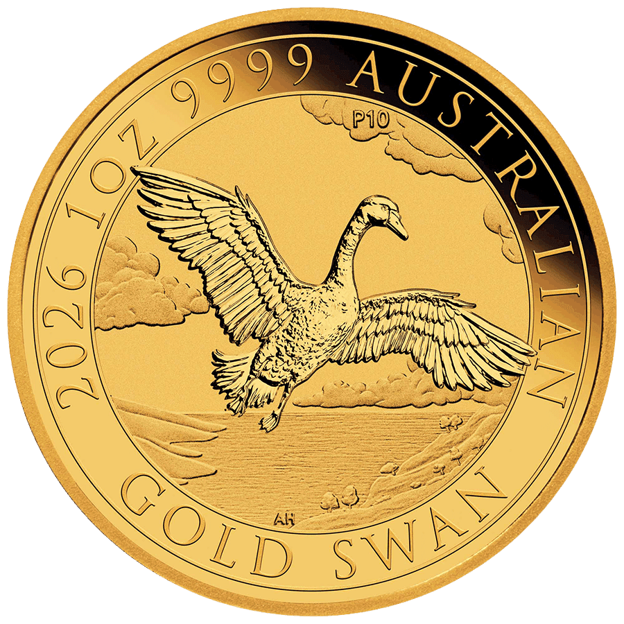 - Revers : Met en valeur un cygne majestueux s’élevant au-dessus d’un lac paisible, avec des nuages en arrière-plan. Inclut l’inscription « 2026 1oz 9999 AUSTRALIAN GOLD SWAN ».