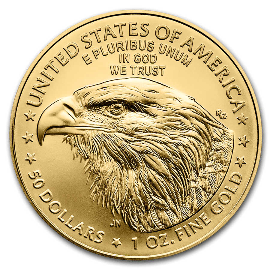 - Revers : Montre le profil puissant d'un aigle dessiné par Jennie Norris, avec les inscriptions : « UNITED STATES OF AMERICA », « E PLURIBUS UNUM », « IN GOD WE TRUST », « 50 DOLLARS » et « 1 OZ. FINE GOLD ».