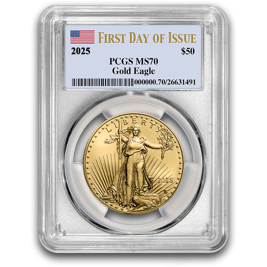 - Emballage : Scellée dans un étui inviolable PCGS avec une étiquette argentée épurée affichant « Gold Eagle », grade MS-70, et la désignation exclusive First Day of Issue accompagnée du drapeau américain.