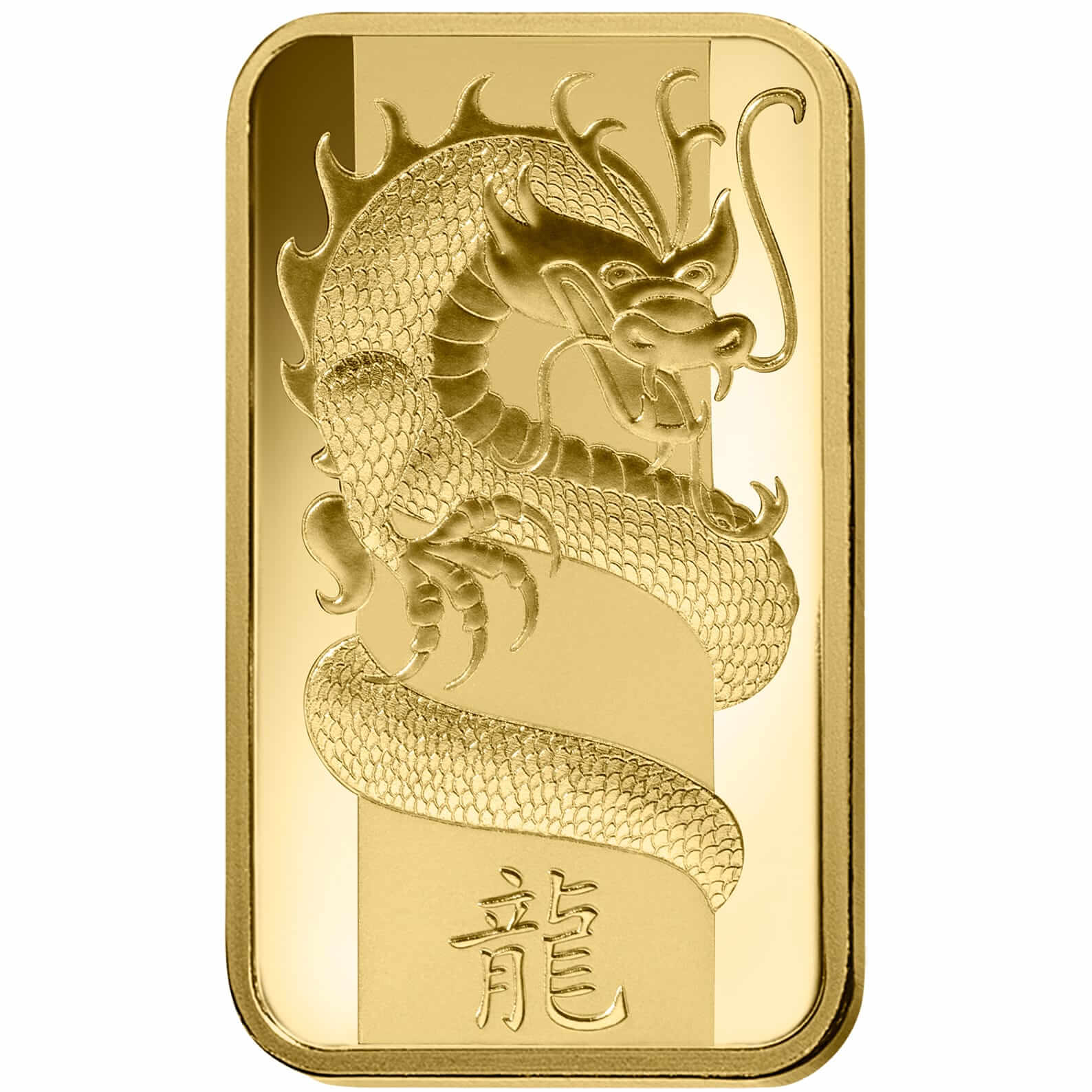 Le magnifique lingotin en or de l’Année du Dragon, de 100 grammes, présente un effet de design saisissant et innovant qui représente le Dragon tant à l’avant qu’à l’arrière - caractéristique de la série du calendrier lunaire PAMP. L’avers du lingotin montre également le symbole chinois qui se traduit par «Dragon» en français, tandis que le revers présente son poids, sa pureté et son numéro de série unique.