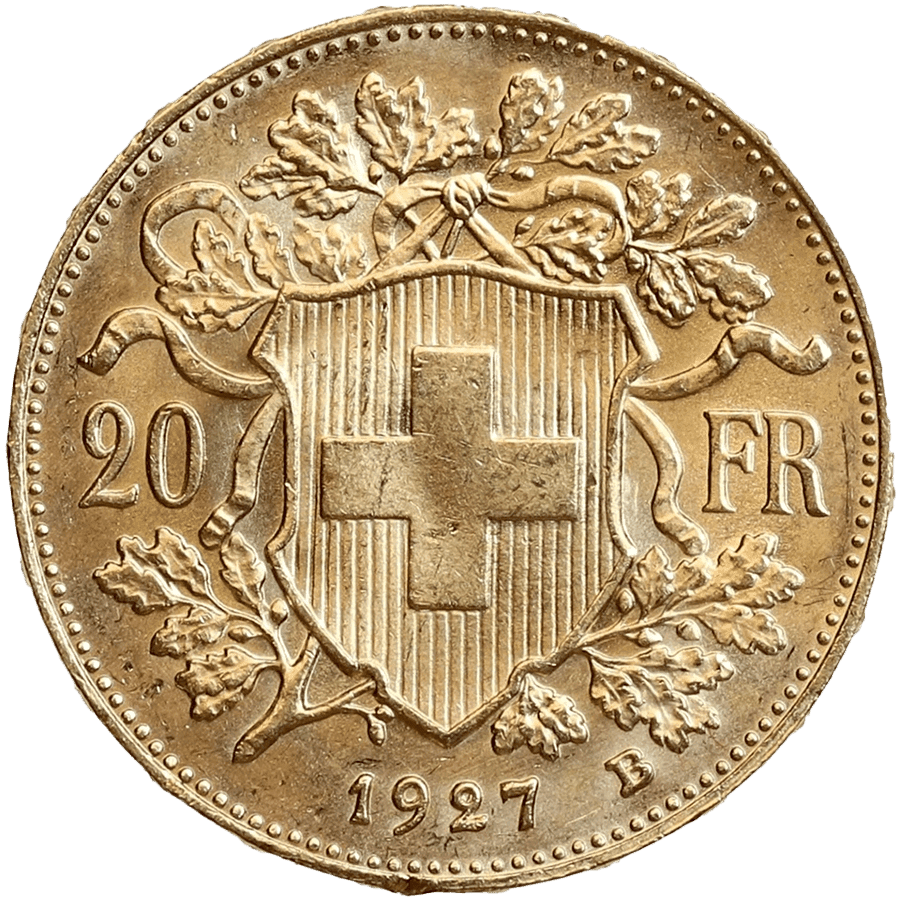- Revers: Affiche le bouclier suisse avec une croix devant une branche de chêne, entouré de la dénomination “20 FR” et de l’année “1927.”