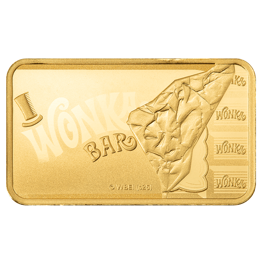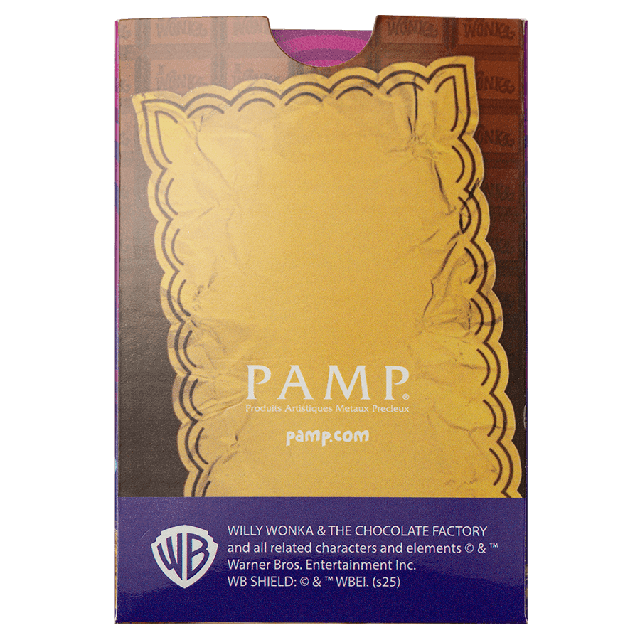 - Avers : Gravé avec le design officiel « Wonka Bar » ainsi que la marque *Willy Wonka & the Chocolate Factory*, associant or pur et nostalgie de la culture pop.