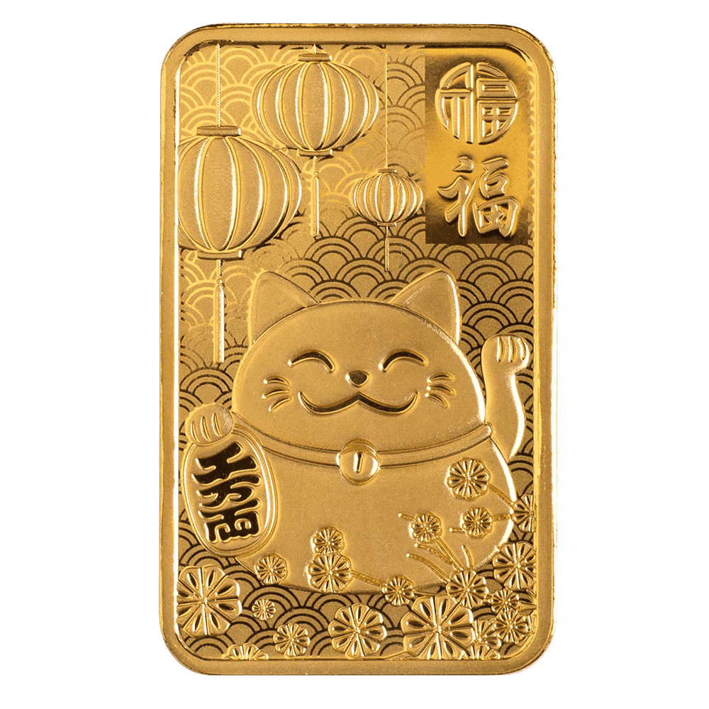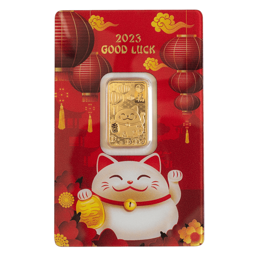 The 2023 Lunar New Year starts on January 22, aligned with the frst new moon of the year. Festivities last until the following full moon. Celebrations close out the old year and bring luck and prosperity for a new one, marked by freworks, the color red and decorated lanterns. This 5g pure gold bar offers wishes for good luck as we celebrate the Lunar New Year! Packaged in a vibrantly colored CertiPAMP card and envelope accented with lanterns this Good Luck bar is individually serialized with a limited mintage of 5,000.