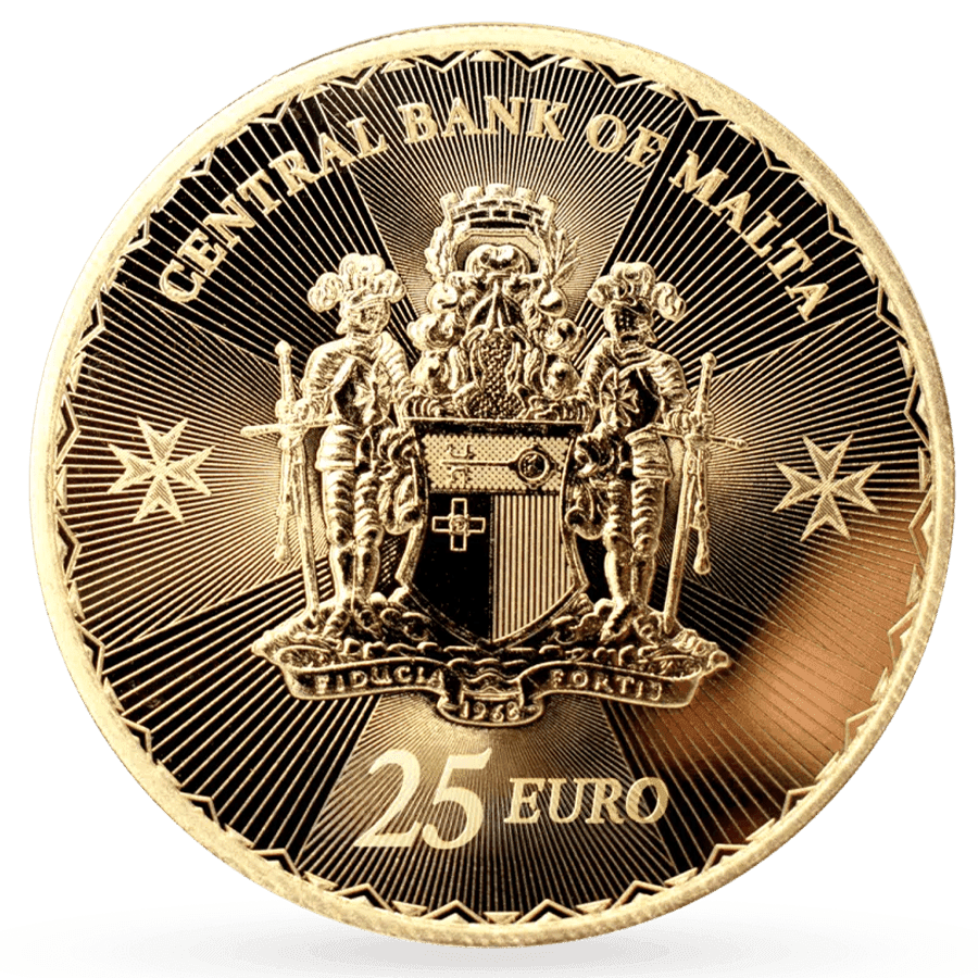 - Revers : Représente l’emblème officiel de la Banque Centrale de Malte, accompagné de la valeur faciale de 25 € ainsi que des spécifications telles que le poids et la pureté.