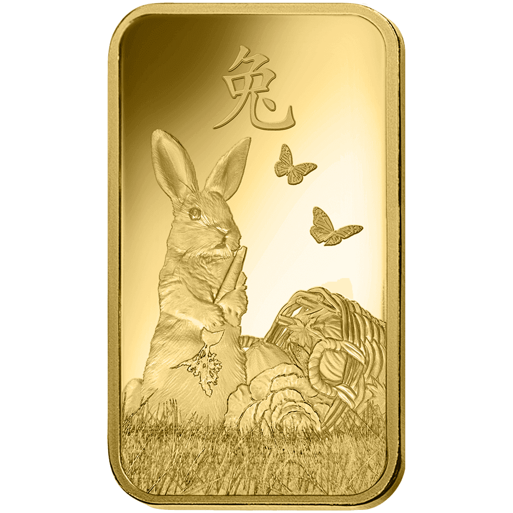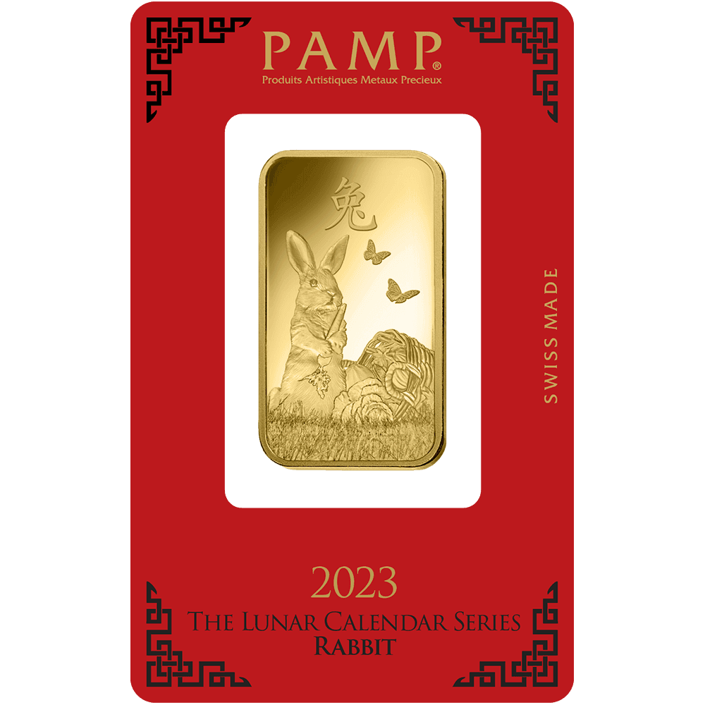 Le lingotin d'or édition année du Lapin de PAMP célèbre l'année 2023 du calendrier lunaire chinois, l'année du Lapin d'eau.
