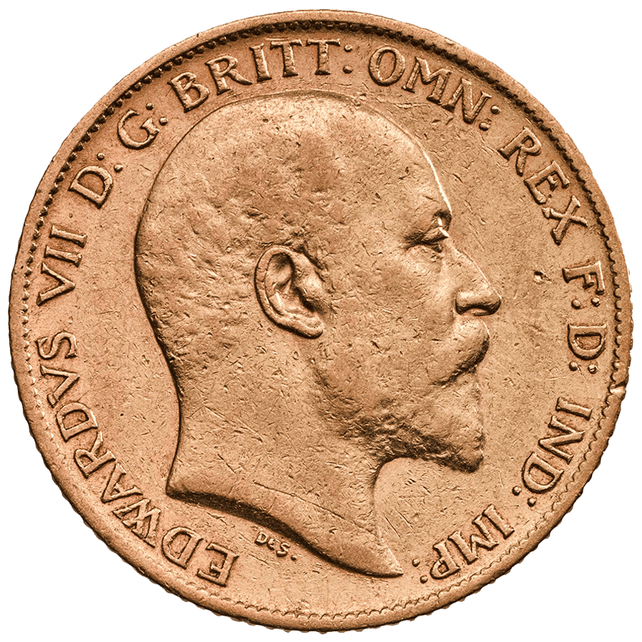 - Avers : Présente un portrait de Roi Édouard VII tourné vers la droite, avec l’inscription latine « EDWARDVS VII D:G: BRITT: OMN: REX F:D: IND: IMP: » autour du bord.