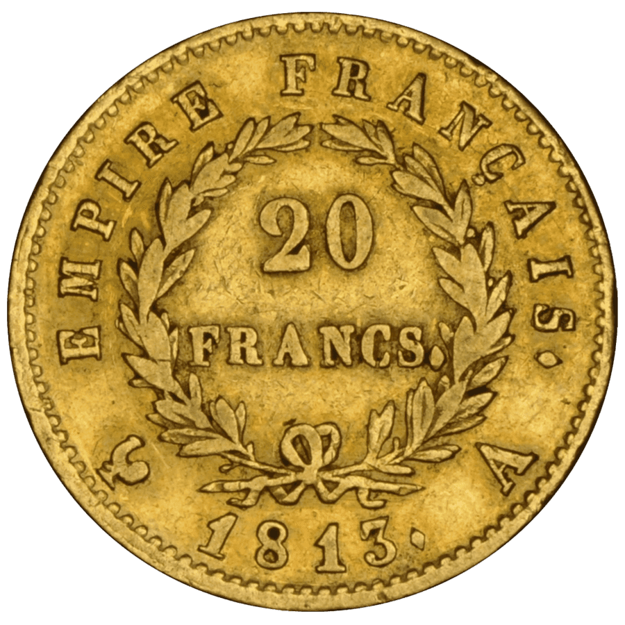 - Avers : Une couronne de laurier entourant l’inscription « 20 FRANCS », avec « EMPIRE FRANÇAIS » gravé autour. L’année et le différent de l’atelier figurent en bas.