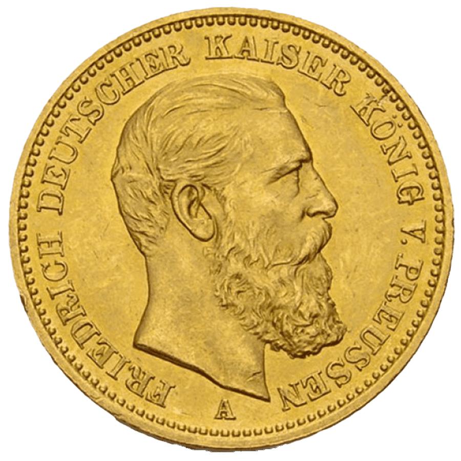 - Revers : Présente un portrait de l'Empereur Friedrich III d'Allemagne, également Roi de Prusse, tourné vers la droite. L’inscription « FRIEDRICH DEUTSCHER KAISER KÖNIG V. PREUSSEN » encercle le portrait, tandis que la lettre « A » en dessous indique que la pièce a été frappée à la Monnaie de Berlin.