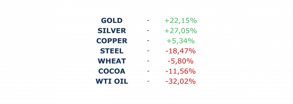 Voici la performance de l'or par rapport aux principales matières premières du 1er janvier 2020 à aujourd'hui: