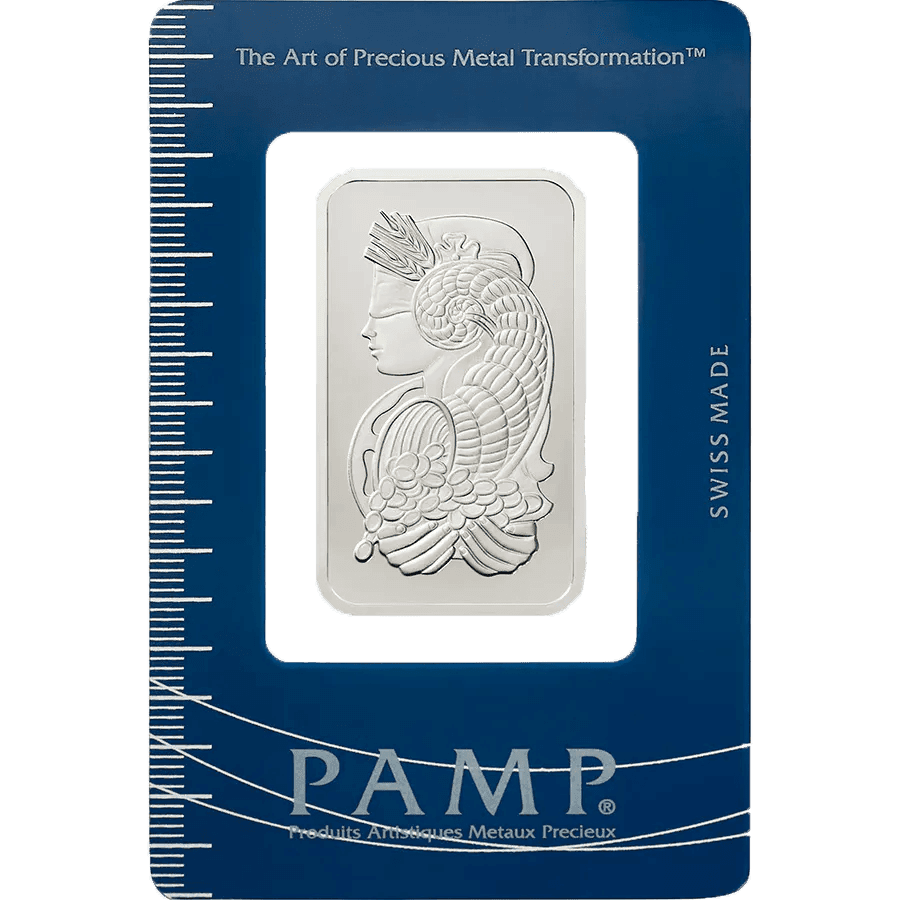 Il lingotto di platino Lady Fortuna di PAMP Suisse da un'oncia (oz), ovvero 31,10 grammi (g), è uno dei lingotti di platino più venduti sul mercato da anni. È splendidamente decorato con la famosa dea romana Fortuna, figlia di Giove.