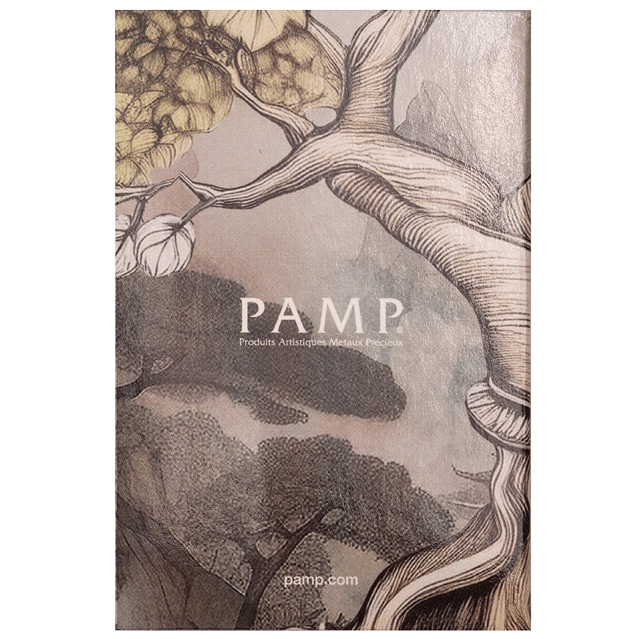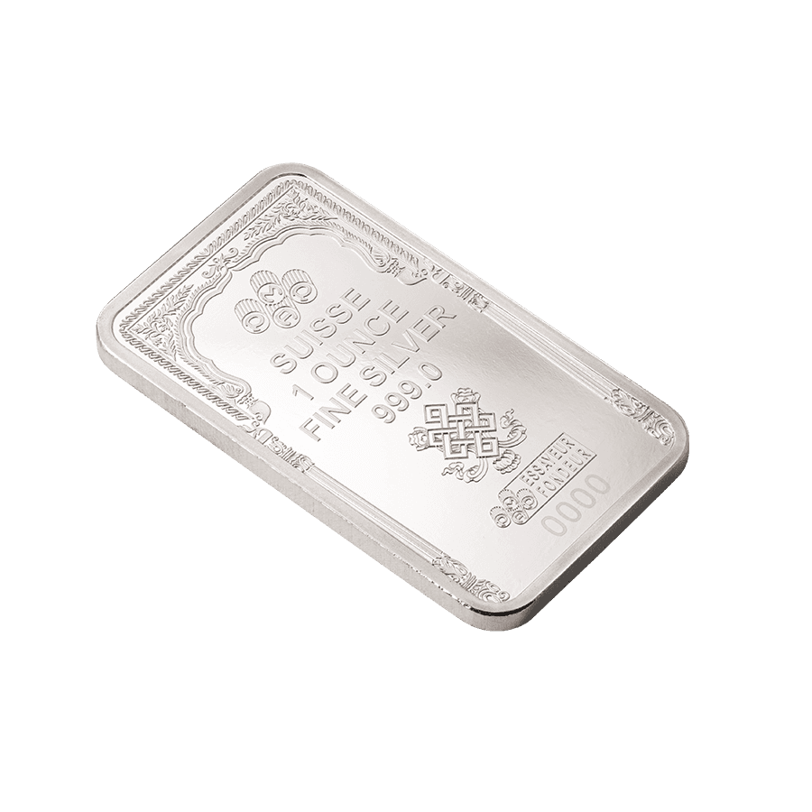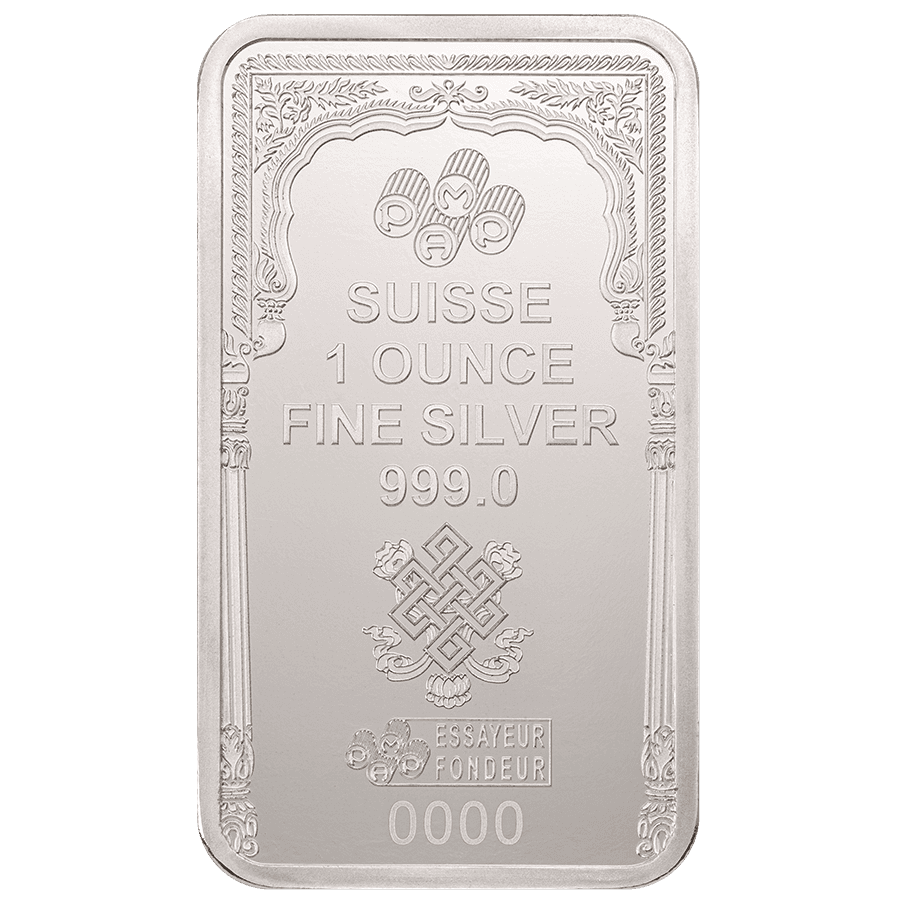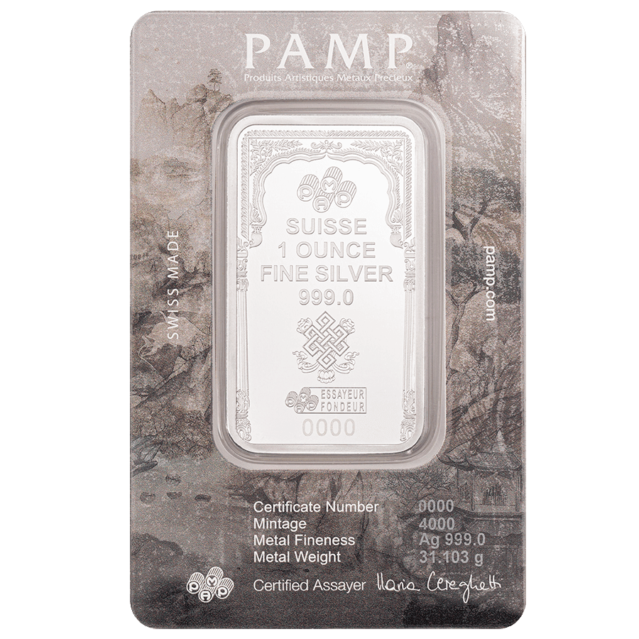 - Fronte: riporta il logo PAMP Suisse, il peso, la purezza "1 ounce fine silver 0.999", il marchio ufficiale “Essayeur Fondeur” (saggiatore fonditore) e un numero di serie unico, il tutto incorniciato da un motivo decorativo.