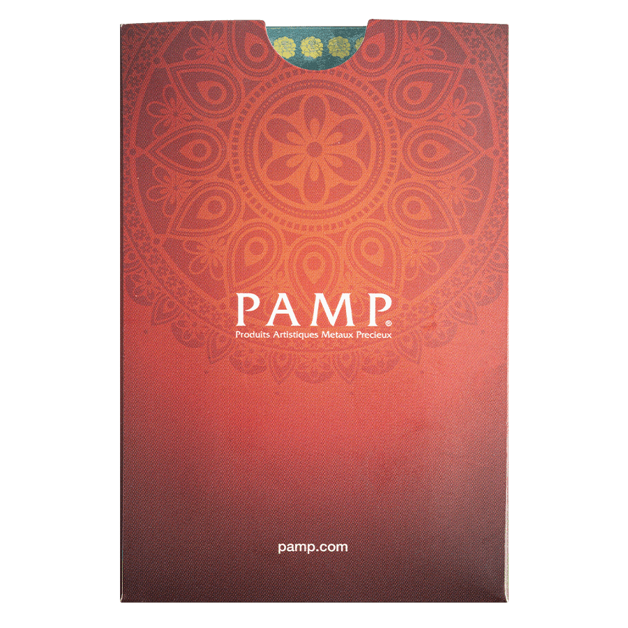 - Rovescio: presenta il logo PAMP Suisse, il peso di 1 oncia, la purezza 999, il timbro della raffineria e un numero di serie univoco, il tutto incorniciato da un motivo ispirato ai disegni tradizionali del Rangoli.