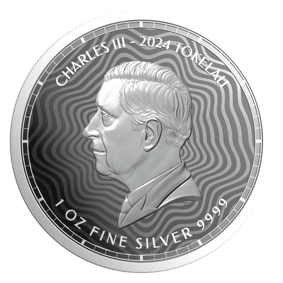 - Dritto: raffigura il ritratto di re Carlo III con le scritte “CHARLES III”, “2024” e “TOKELAU”, insieme al valore nominale di 6 dollari e all’indicazione della purezza “1 OZ FINE SILVER 9999”.