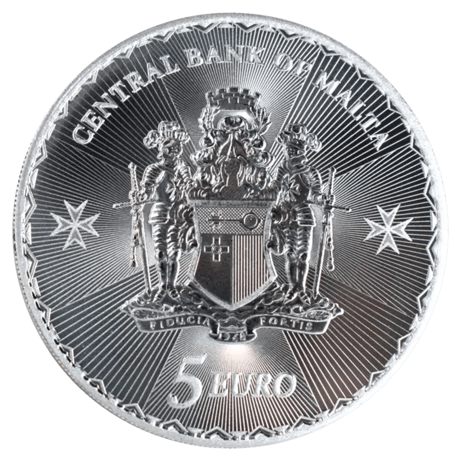 - Rovescio: mostra lo stemma ufficiale di Malta, con la scritta “CENTRAL BANK OF MALTA” (Banca centrale di Malta), il valore nominale di “5 EURO” e il motto nazionale “FIDUCIA FORTIS” (Nella fiducia sta la forza).