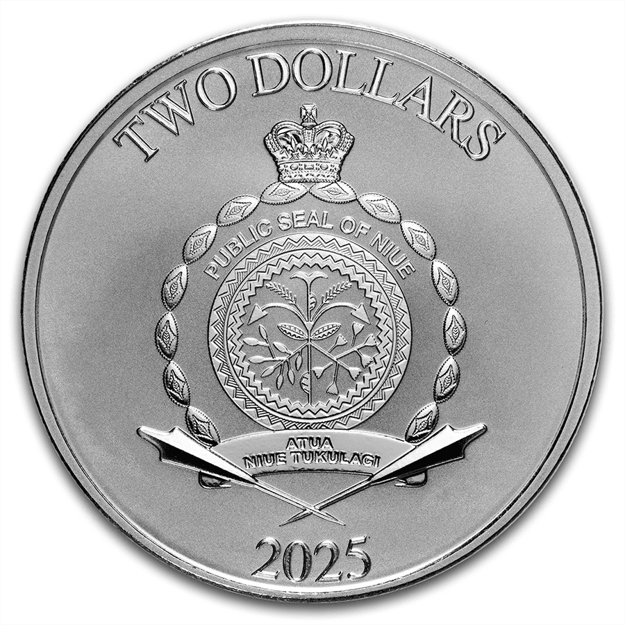 - Dritto: presenta il sigillo ufficiale di Niue con la scritta “TWO DOLLARS” (due dollari) in alto e l’anno “2025” in basso.