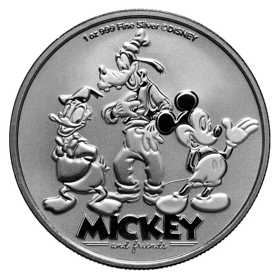 - Rovescio: riunisce i personaggi Disney più amati — Paperino, Pippo e Topolino — raffigurati in una posa allegra e dinamica. L’incisione recita “1 oz 999 Fine Silver ©DISNEY” (1 oncia argento puro 999 ©DISNEY) in alto e “MICKEY and friends” in basso.