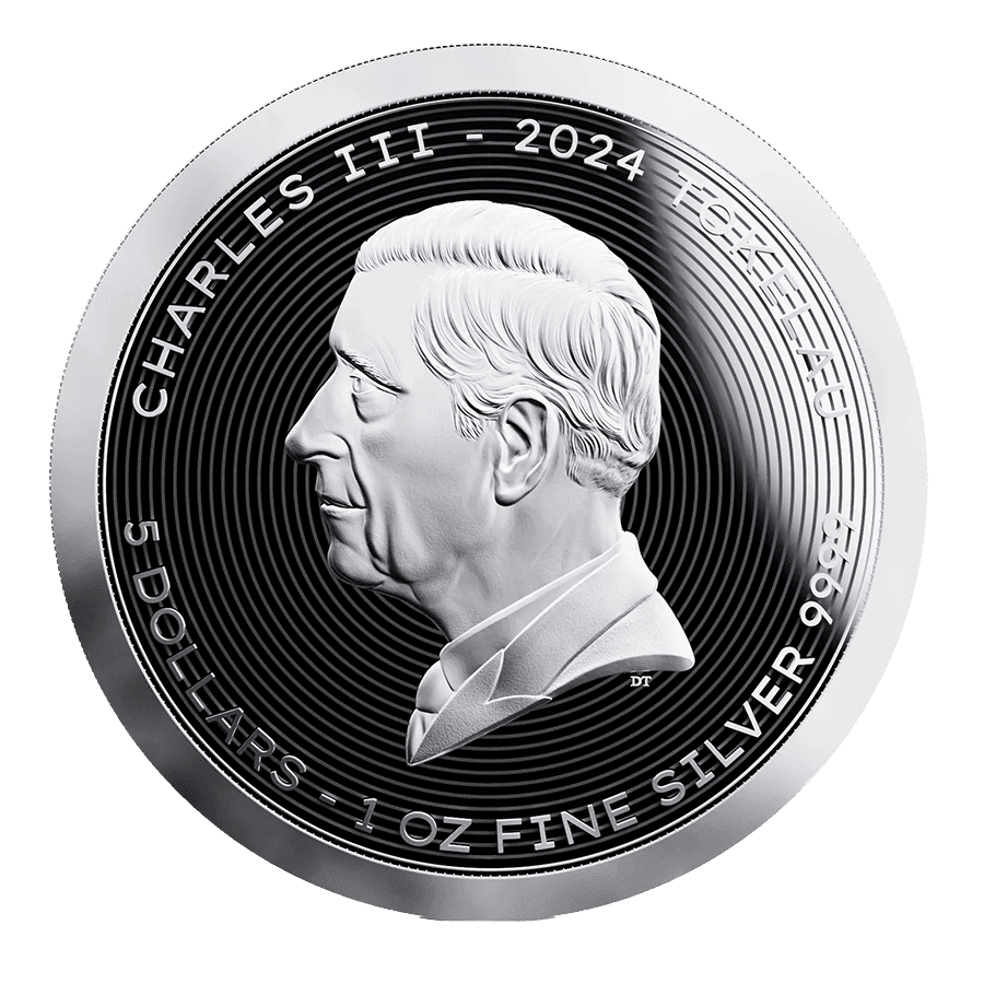 - Dritto: raffigura l’effigie di re Carlo III con le scritte “CHARLES III”, “2024” e “TOKELAU”, insieme al valore nominale di 5 dollari e all’indicazione di purezza “1 OZ FINE SILVER 9999”.