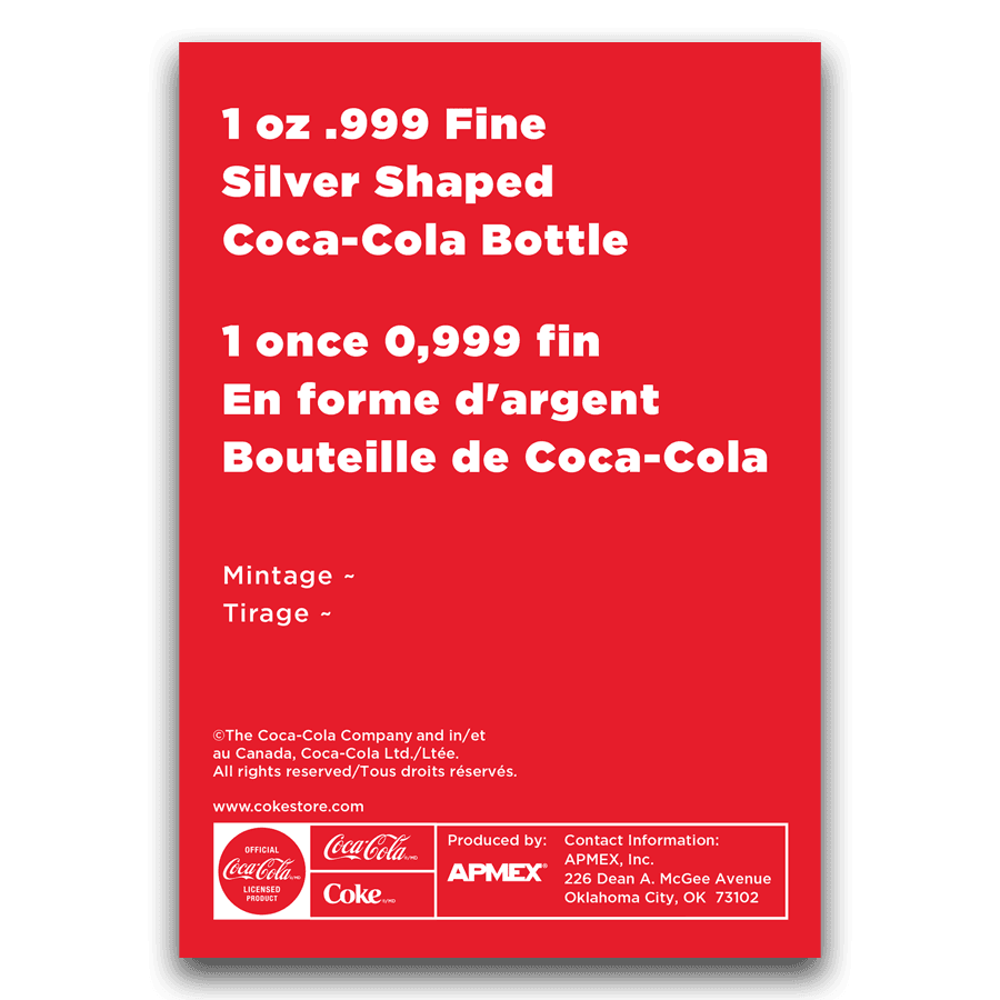 Questa moneta d’argento a forma di bottiglia Coca-Cola in argento da 1 oz in edizione limitata è un pezzo da collezione unico, ideale per gli appassionati di Coca-Cola o anche come regalo senza tempo. Il suo design classico e la tiratura limitata la rendono un'aggiunta preziosa a qualsiasi collezione. Confezionato in una speciale lattina con certificato di autenticità, questo pezzo da collezione celebra la storia di uno dei marchi più iconici della storia.