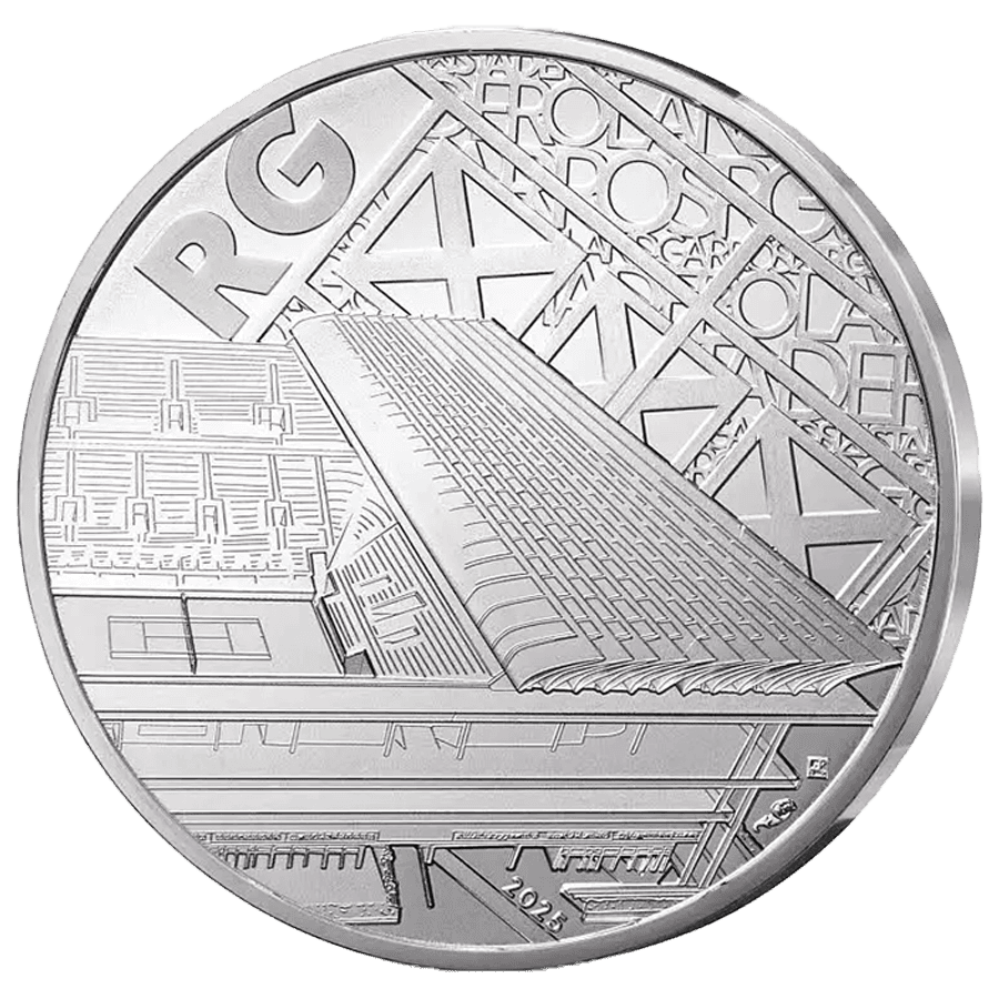 - Dritto: raffigura una prospettiva dinamica del campo Philippe-Chatrier con i dettagli architettonici del tetto Moucharabieh e le iniziali “RG” in rilievo (che stanno per Roland Garros). Il testo sovrapposto e le linee angolari celebrano il design moderno dello stadio.