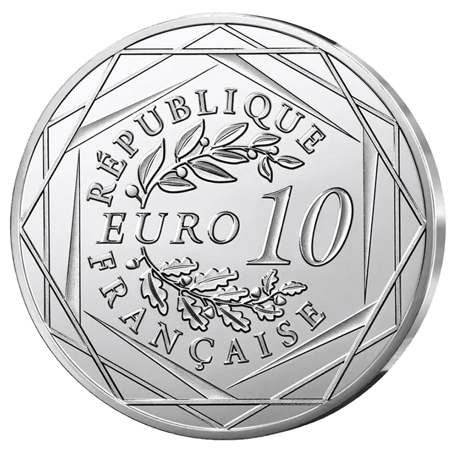- Rovescio: presenta un esagono stilizzato incorniciato da foglie di alloro e quercia, che circondano le scritte “RÉPUBLIQUE FRANÇAISE” e il valore nominale di “EURO 10”.