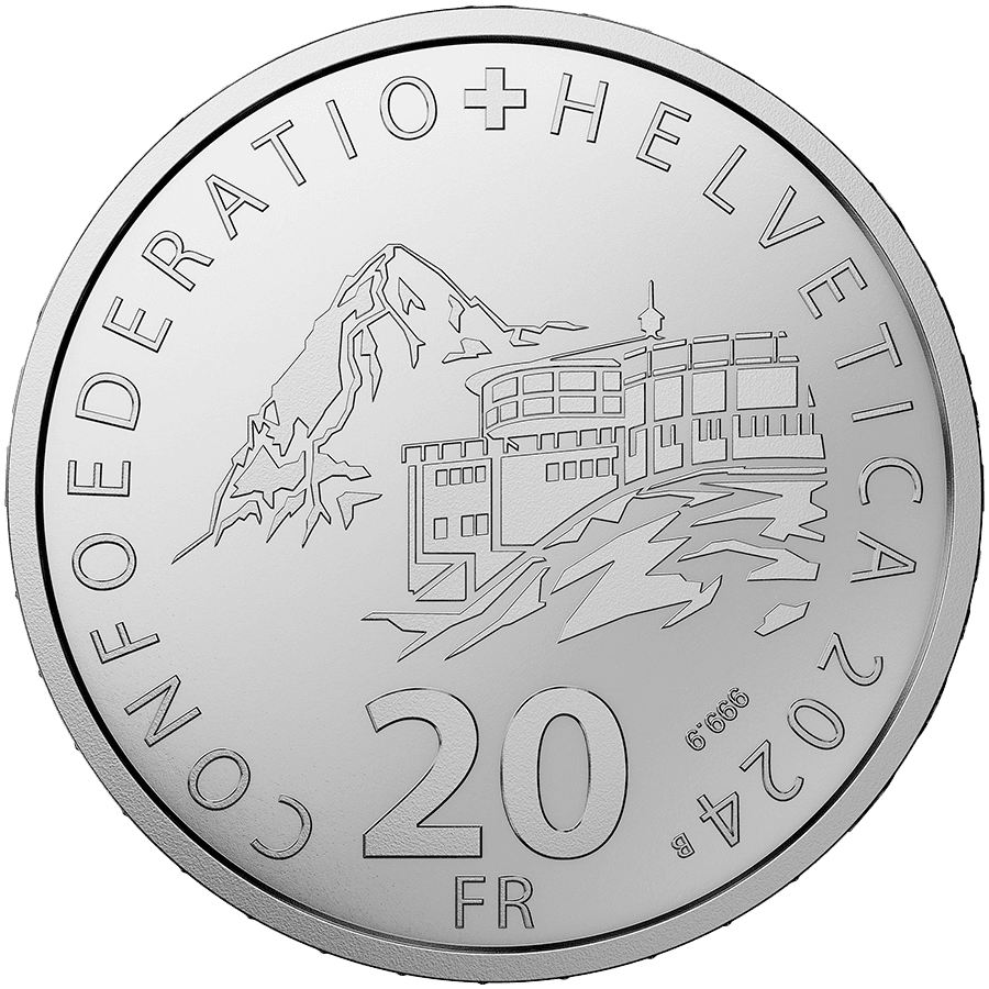 - Dritto: raffigura l’edificio arroccato sulla vetta dello Schilthorn, con contorni alpini minimalisti. Il design include la scritta “CONFOEDERATIO HELVETICA 2024” (Confederazione elvetica 2024), il valore nominale di 20 franchi e i marchi relativi a purezza e zecca.