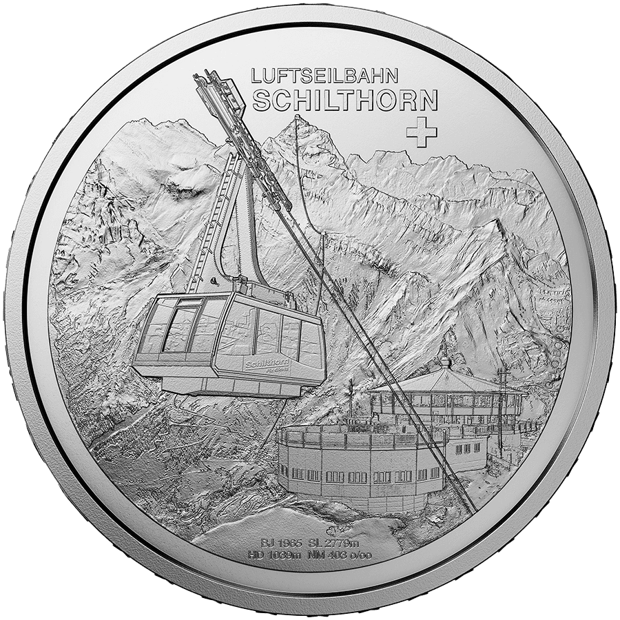 - Rovescio: rappresenta la funivia Luftseilbahn in piena ascesa sopra il paesaggio alpino, con il ristorante dello Schilthorn sotto e le vette scoscese sullo sfondo. Include le scritte “LUFTSEILBAHN SCHILTHORN”, una croce svizzera e i dettagli relativi a quota e costruzione.