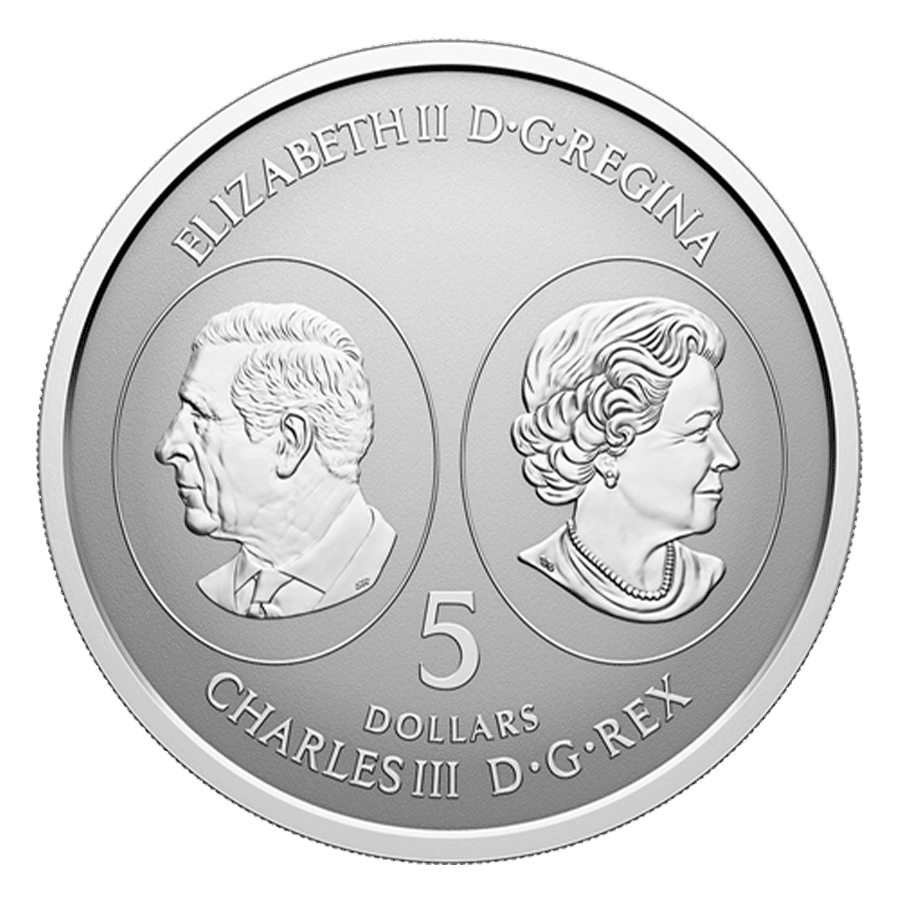 - Dritto: presenta la doppia effigie di re Carlo III e della regina Elisabetta II, insieme per la prima volta nella storia numismatica canadese.