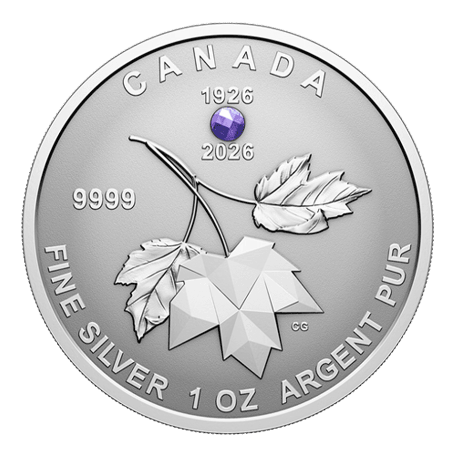 - Rovescio: raffigura la celebre foglia d’acero canadese, impreziosita da un inserto di cristallo viola sulla moneta da 1 oncia, simbolo dell’eredità reale e della maestria artistica canadese.