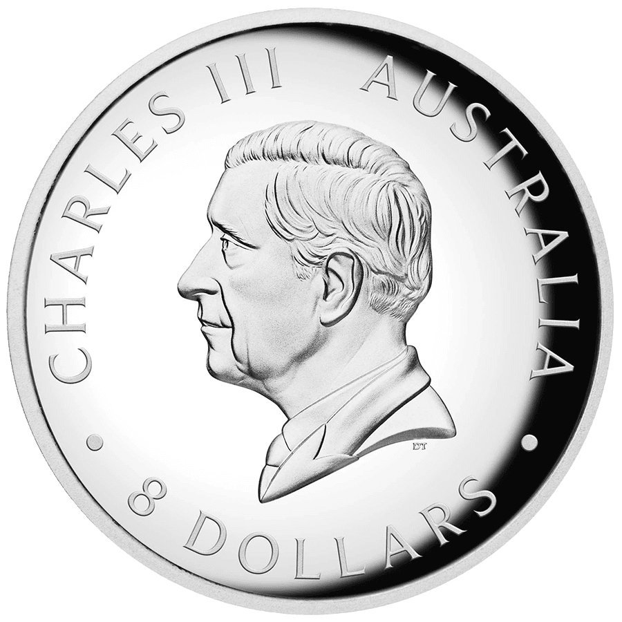 - Dritto: raffigura l’effigie di Sua Maestà Re Carlo III, con il valore nominale di 8 dollari e la dicitura del Paese emittente “AUSTRALIA”.