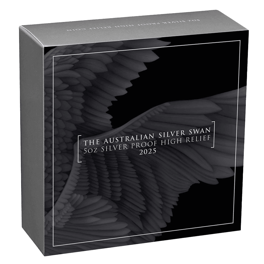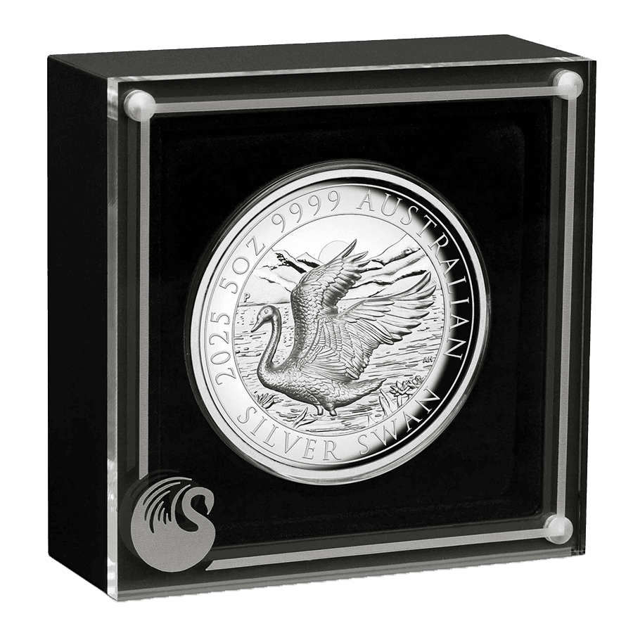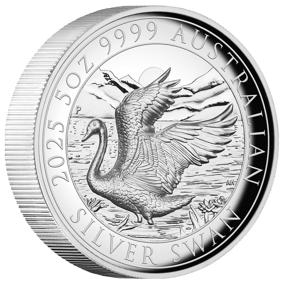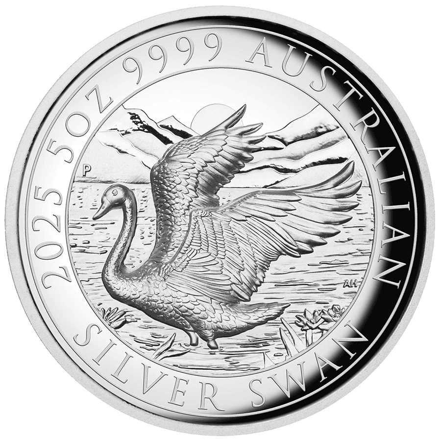 - Rovescio: un elegante cigno sbatte le ali sullo sfondo di un tramonto sereno, incorniciato da una catena montuosa e da fiori di loto. Il design in alto rilievo cattura ogni dettaglio con straordinaria nitidezza. Le scritte includono “2025 5oz 9999 AUSTRALIAN SILVER SWAN” (Cigno australiano d'argento 999,9 5 once 2025) e il segno di zecca “P” della Perth Mint.
