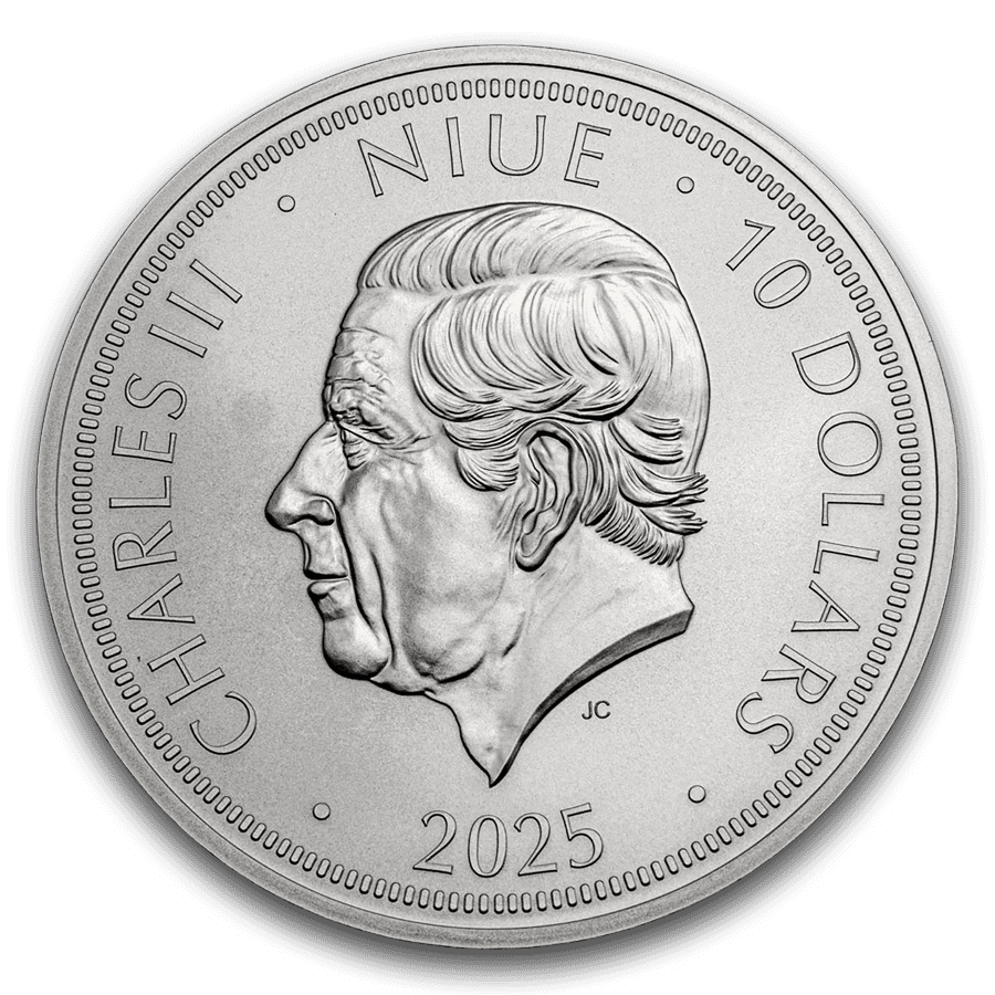 - Dritto: raffigura l’effigie di Re Carlo III con le scritte “NIUE · 10 DOLLARS · 2025”, a conferma del suo status di moneta a corso legale.
