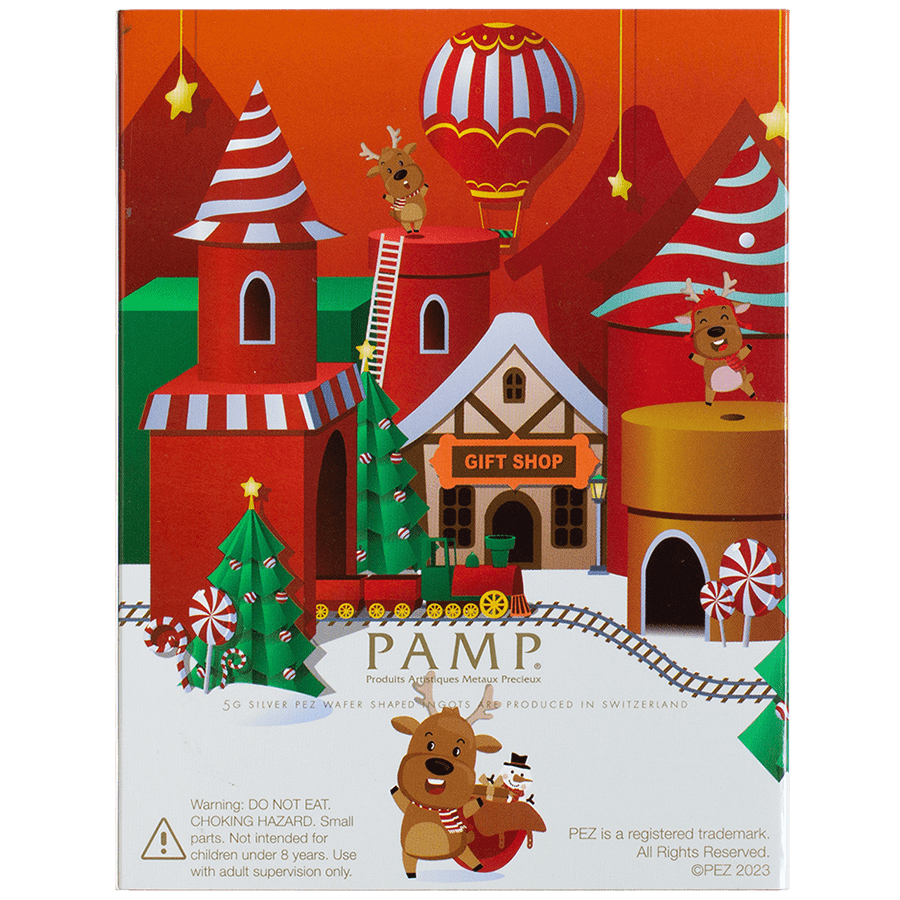 inciso sulla parte anteriore.Sul retro, invece, vengono fornite informazioni importanti, come il peso e il livello di purezza (pari a 999,9), nonché il marchio di autenticità PAMP e l’esclusivo design a forma di renna. Il cofanetto PEZ