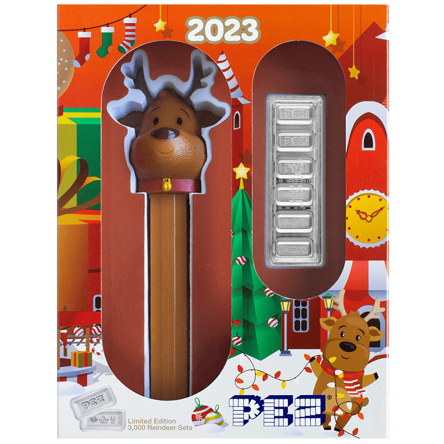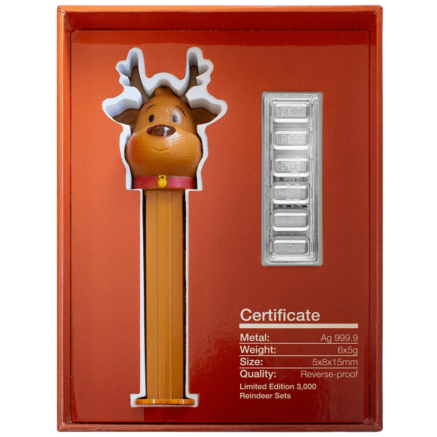 Reindeer Silver Wafers & DispenserIl cofanetto è coniato in edizione limitata da 4.000 pezzi e comprende quasi 1 oncia di argento puro, suddiviso in 6 pezzi da 5 grammi l’uno presentati in una capsula personalizzata. Questo cofanetto con dispenser PEZ