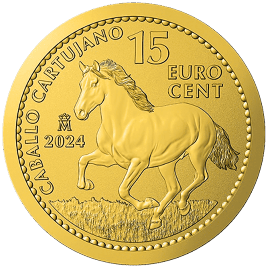 - Rovescio: raffigura un cavallo certosino o Cartujano in una potente posa frontale, con una criniera fluente e una muscolatura definita. Il design include dettagli testurizzati del terreno e le scritte “CABALLO CARTUJANO”, “15 EURO CENT” e “2024”.
