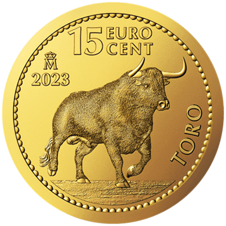 - Rovescio: mostra un toro spagnolo in posizione eretta e fiera, che emana forza ed equilibrio. Il design include le scritte “TORO”, “0,15 EURO” e “2023”.