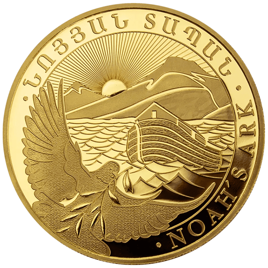 - Rovescio: uno splendido design raffigura l’Arca di Noè che galleggia sull’acqua, con il Monte Ararat e un sole nascente sullo sfondo. Una colomba che porta un ramoscello di ulivo completa l’immagine, simbolo di pace e speranza. La scritta dice "Arca di Noè" in inglese (“Noah's Ark”) e armeno.