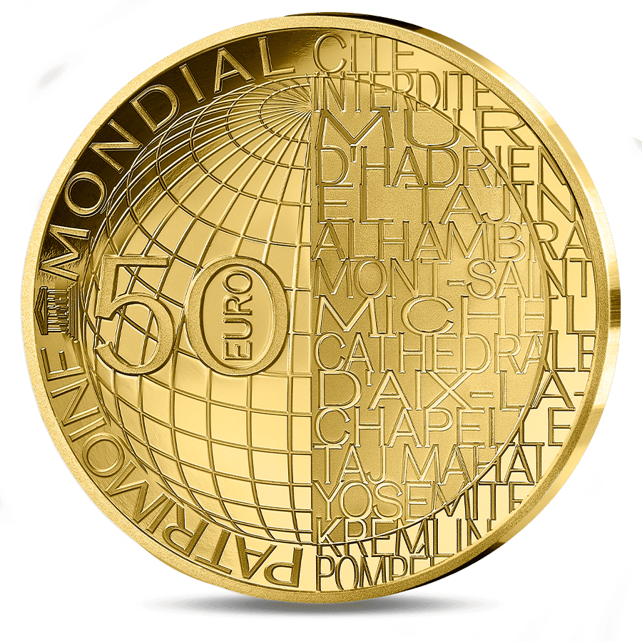 - Rovescio: un globo stilizzato con i nomi dei siti patrimonio dell’umanità UNESCO, le iniziali “RF” e il valore nominale di 50 euro.