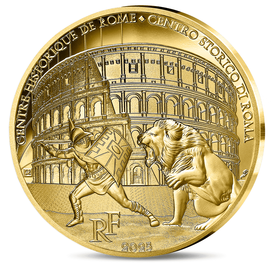 - Dritto: raffigura il Colosseo di Roma in posizione dominante, con un gladiatore e un leone in primo piano. Le scritte “CENTRE HISTORIQUE DE ROME” e “CENTRO STORICO DI ROMA” sottolineano il riconoscimento UNESCO.