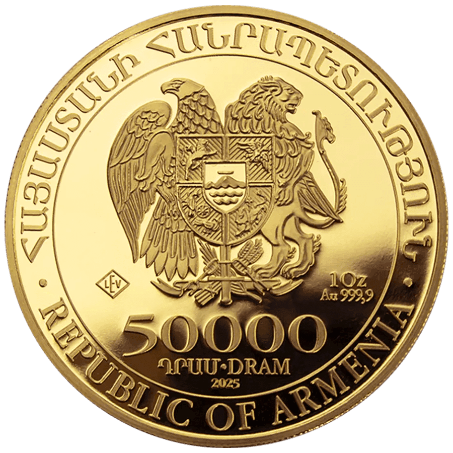 - Dritto: la parte anteriore mostra lo stemma della Repubblica d'Armenia, con un’aquila e un leone che sorreggono uno scudo raffigurante l’Arca di Noè al centro. Le scritte includono “50,000 Dram”, il peso pari a “1 oz”, la purezza dell'oro (“Au 999,9”) e l’anno “2025.”