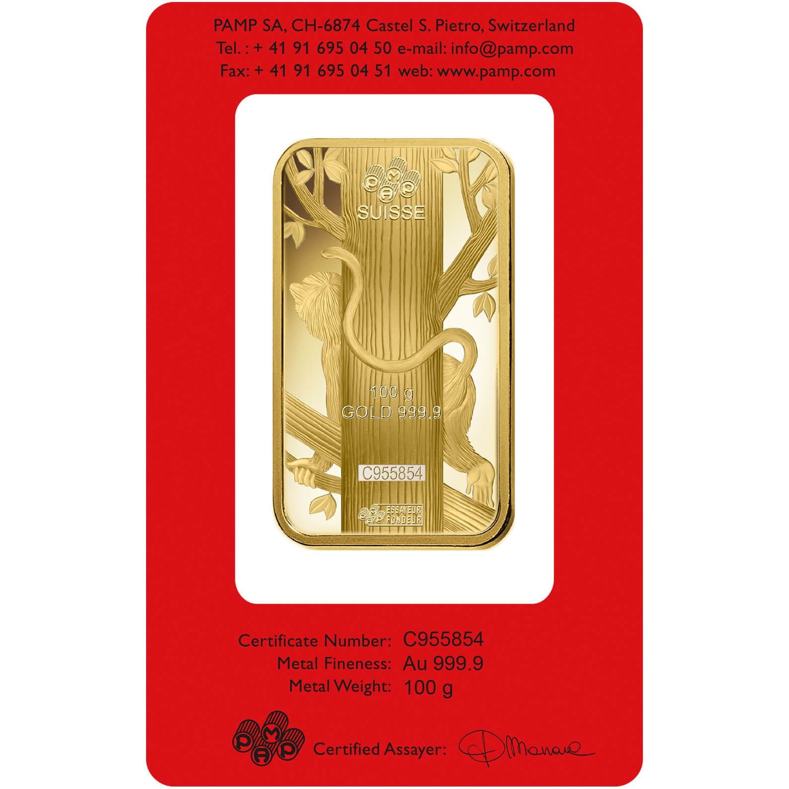 100 grammi Lingottino d'Oro - PAMP Suisse Lunar Scimmia