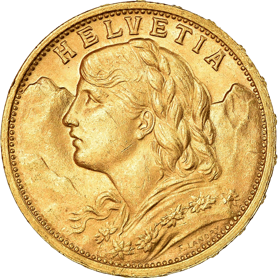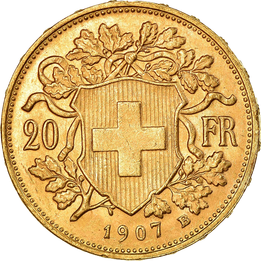- Rovescio: presenta lo scudo svizzero con una croce, davanti a un ramo di quercia, circondato dal valore nomimale di “20 FR” e dall’anno “1907”.