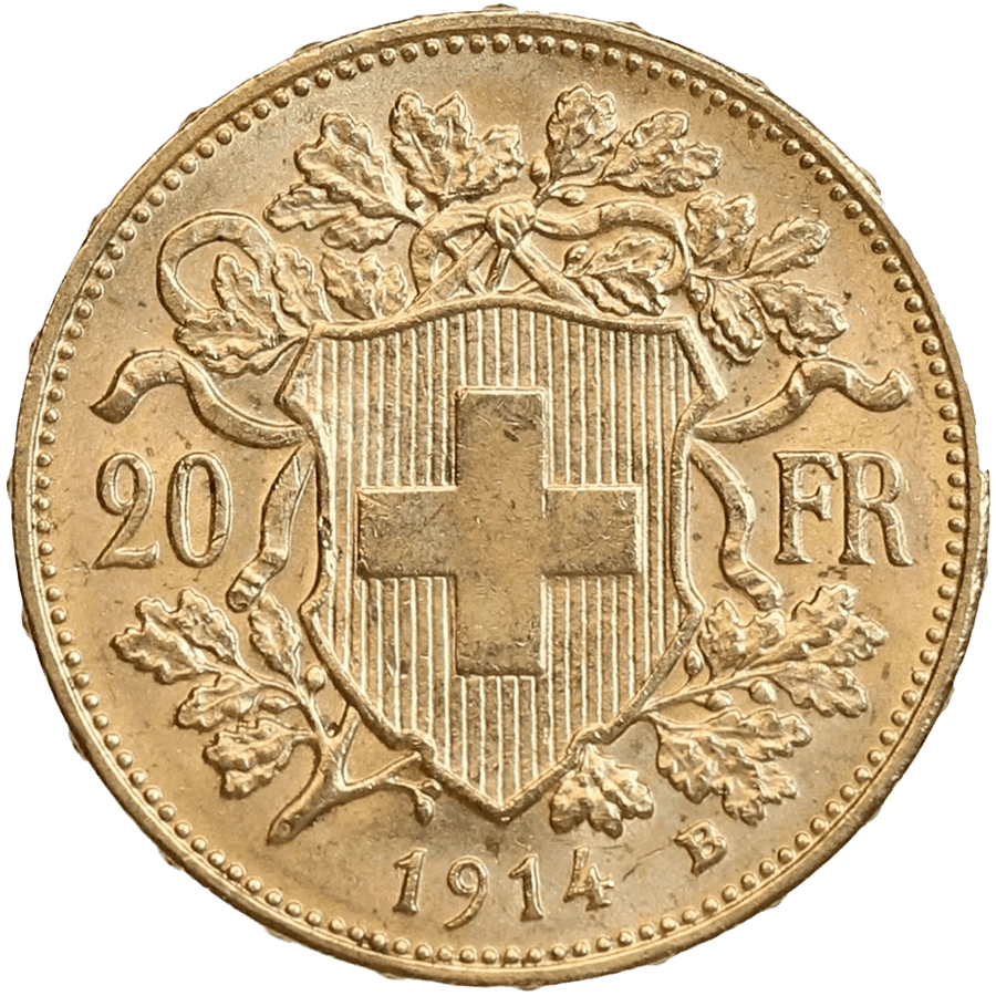 - Rovescio: presenta lo scudo svizzero con una croce, davanti a un ramo di quercia, circondato dal valore nomimale di “20 FR” e dall’anno “1914”.