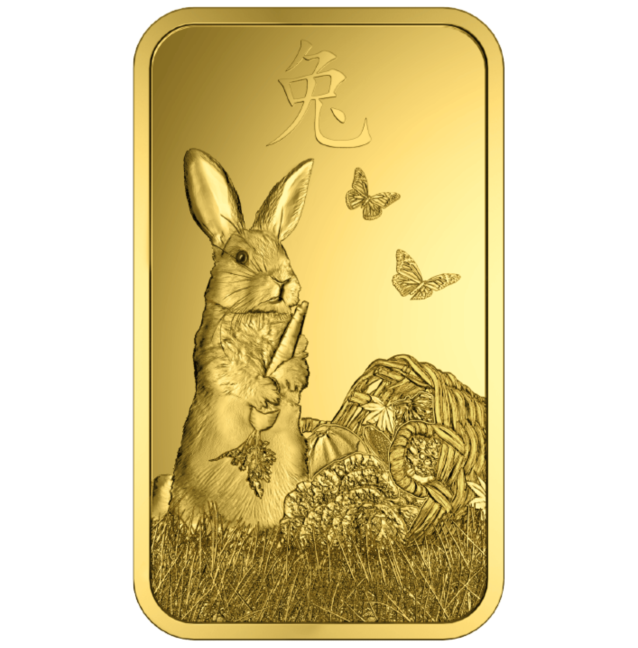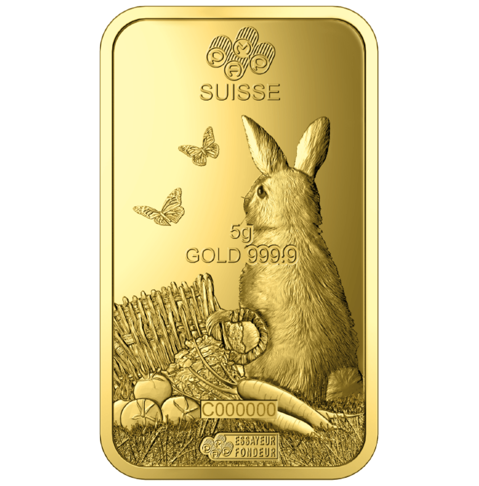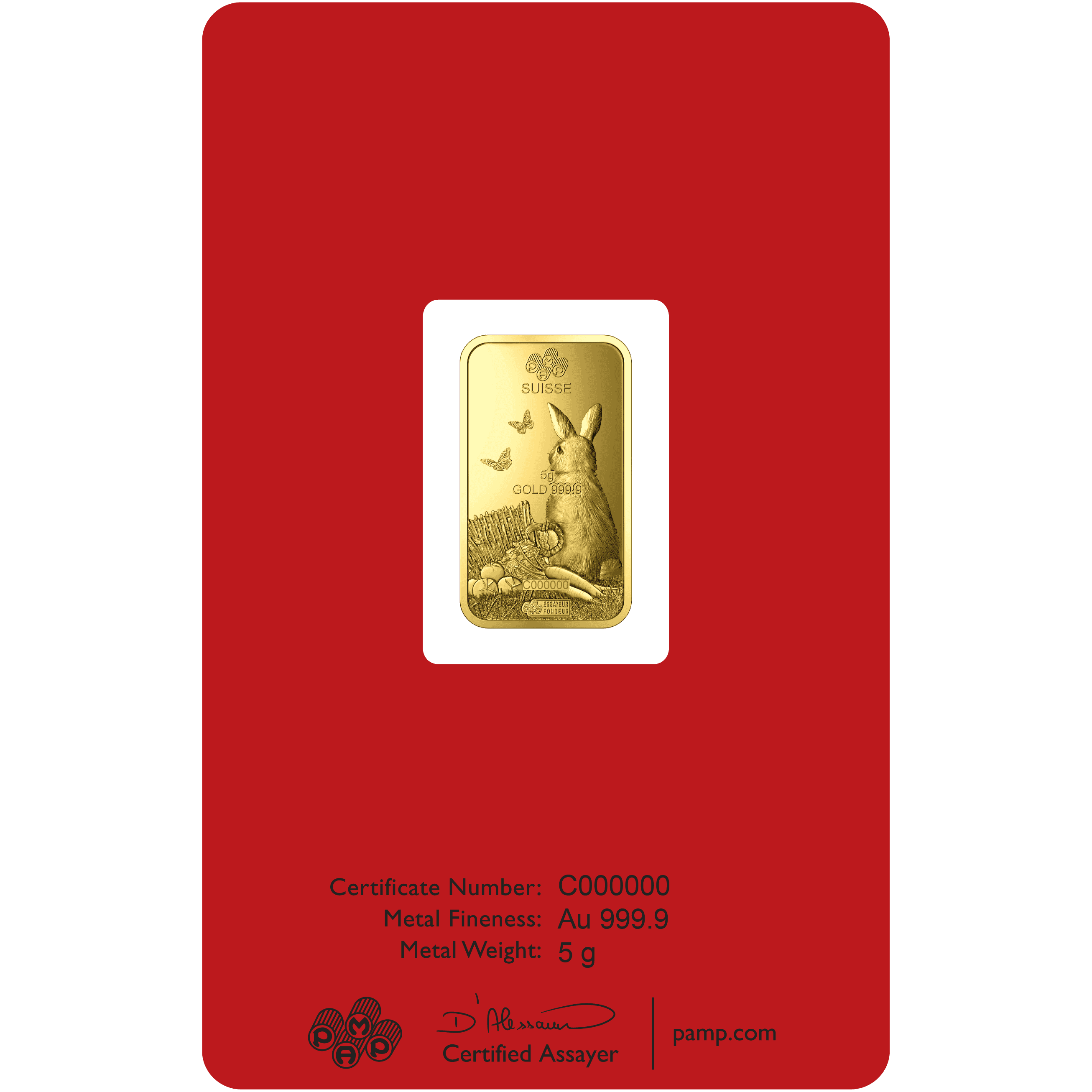 Tutti i lingotti d’oro appartenenti alla serie del calendario lunare sono incisi con il simbolo corrispondente al rispettivo animale dell’oroscopo cinese. Il fronte del lingotto d’oro PAMP Coniglio lunare da 5 grammi rappresenta un coniglio che tiene una carota seduto vicino a un cestino rovesciato pieno di verdure, con sopra il simbolo cinese corrispondente a “Coniglio”. Il rovescio del lingotto, invece, raffigura il coniglio visto da dietro. Inoltre, sul lingotto sono incisi la purezza, il numero di serie e il peso.