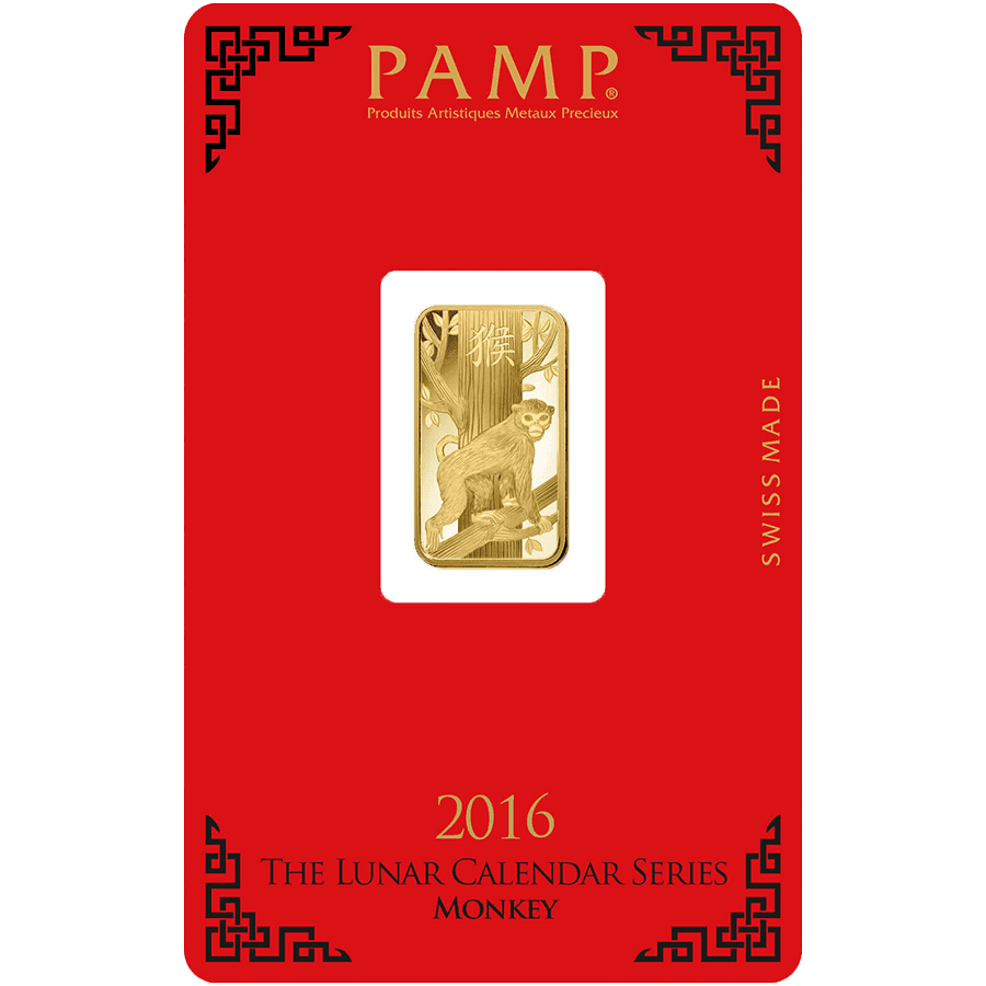 In commemorazione del Capodanno cinese, l'edizione 2016 della popolare serie di calendari lunari di PAMP celebra l'Anno della Scimmia con uno splendido design del lingotto che riflette brillantemente le qualità attribuite all'animale in tutta la cultura cinese.