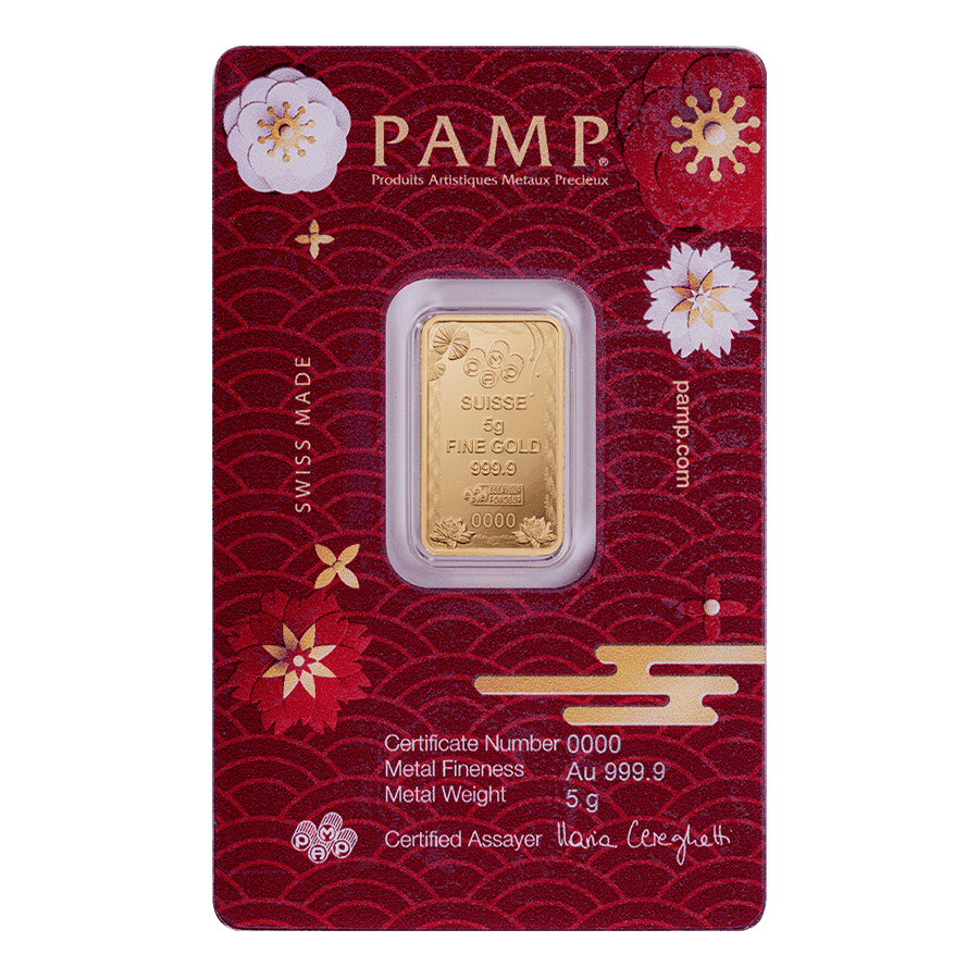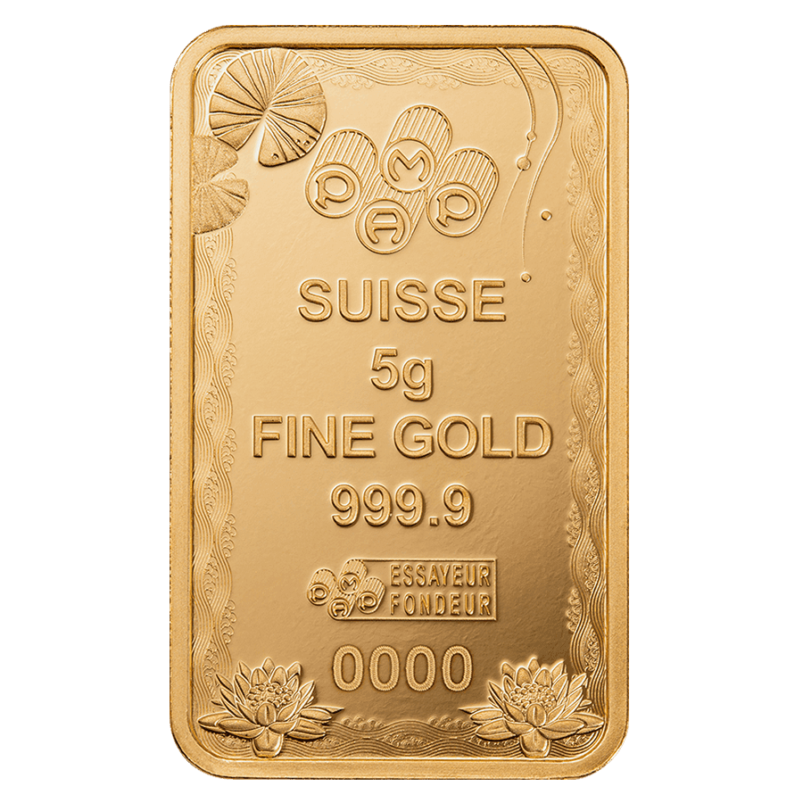 - Retro: Il retro mostra il logo PAMP Suisse con le indicazioni "SUISSE", "5g", "FINE GOLD" e "999,9" a garanzia del peso e della purezza del lingotto. Un numero di serie univoco e il timbro "Essayeur Fondeur" ne certificano l'autenticità, accompagnati da dettagliati motivi di loto.