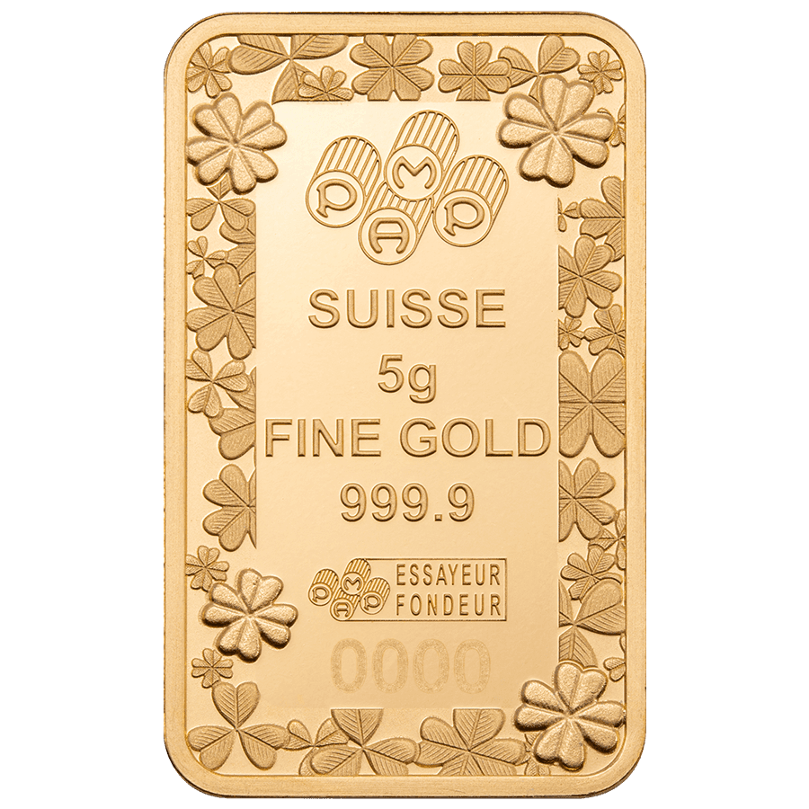 - Dritto: la parte anteriore presenta il logo PAMP Suisse con l'indicazione del peso, della purezza e il marchio di certificazione "Essayeur Fondeur" (Saggiatore fonditore).