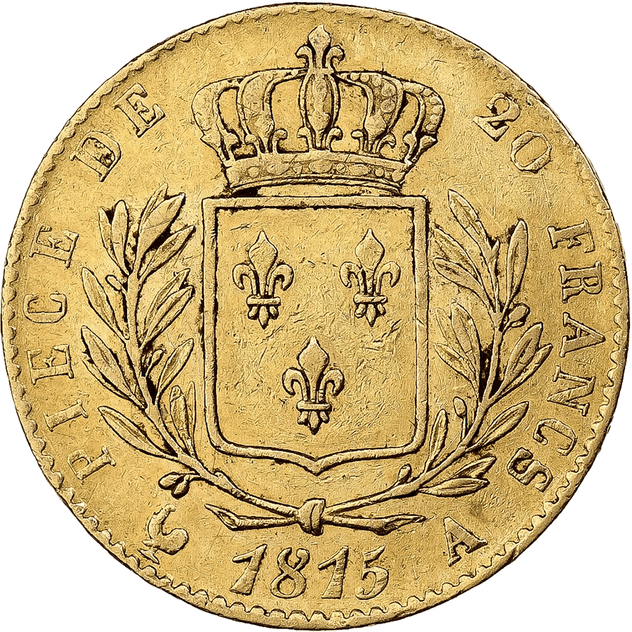 Questa moneta d'oro da 20 franchi francesi, in discreto stato di conservazione, è stata coniata durante la Restaurazione Borbonica (1814-1815), segnando il ritorno di Re Luigi XVIII sul trono francese dopo l'abdicazione di Napoleone. Con la sua purezza di oro fino 0,900, conserva un valore intrinseco e attira i collezionisti per la sua testimonianza di un momento cruciale nella storia francese. Emessa dalla Monnaie de Paris, questa moneta costituisce un pezzo ricercato per gli appassionati di numismatica reale e storica.